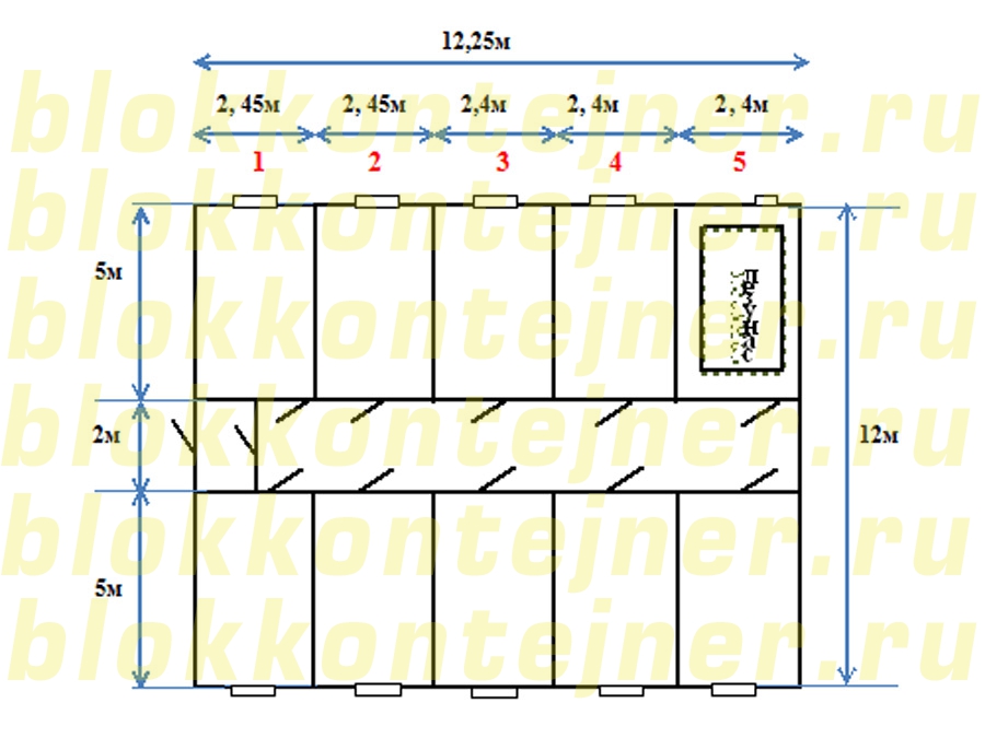 Модульное здание «Штаб»   в 1-этаж, размер: (12,25 *12,0*2,5м) состоит из 10 единиц БК размер 5,0*2,45*2,5м: